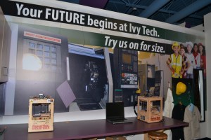 Themed “Dream it. Then achieve it at Ivy Tech Community College.” the space has been brought to life with wall-to-wall photos and graphics that provide a campus-like atmosphere as well as a three-dimensional advanced manufacturing environment. There is also a display entitled “Your future begins at Ivy Tech. Try us on for size.” where students are encouraged to dress up in various professional career attire available.
