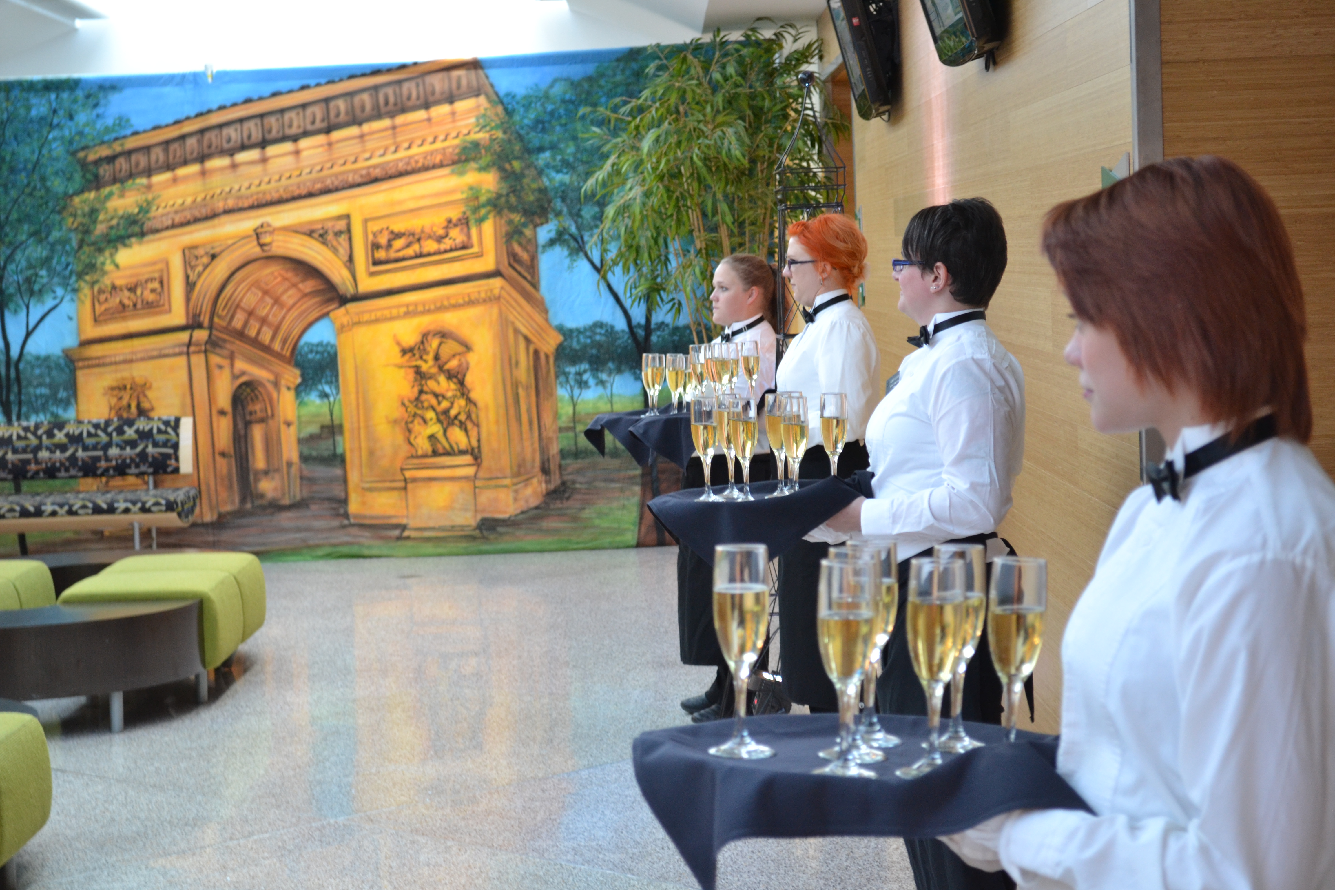 After guests registered, they received a glass of champagne from student servers. Cheers!