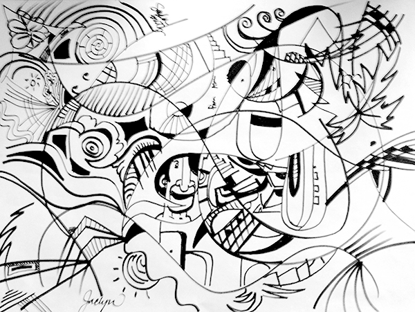 After he shared some of his art–both realistic and abstract–and when the audience ran out of questions, he invited people to sit with him a draw. Jaclyn Garver, who works in marketing with me, and I sat with him for about 15 minutes, shared a piece of paper and created this drawing.
