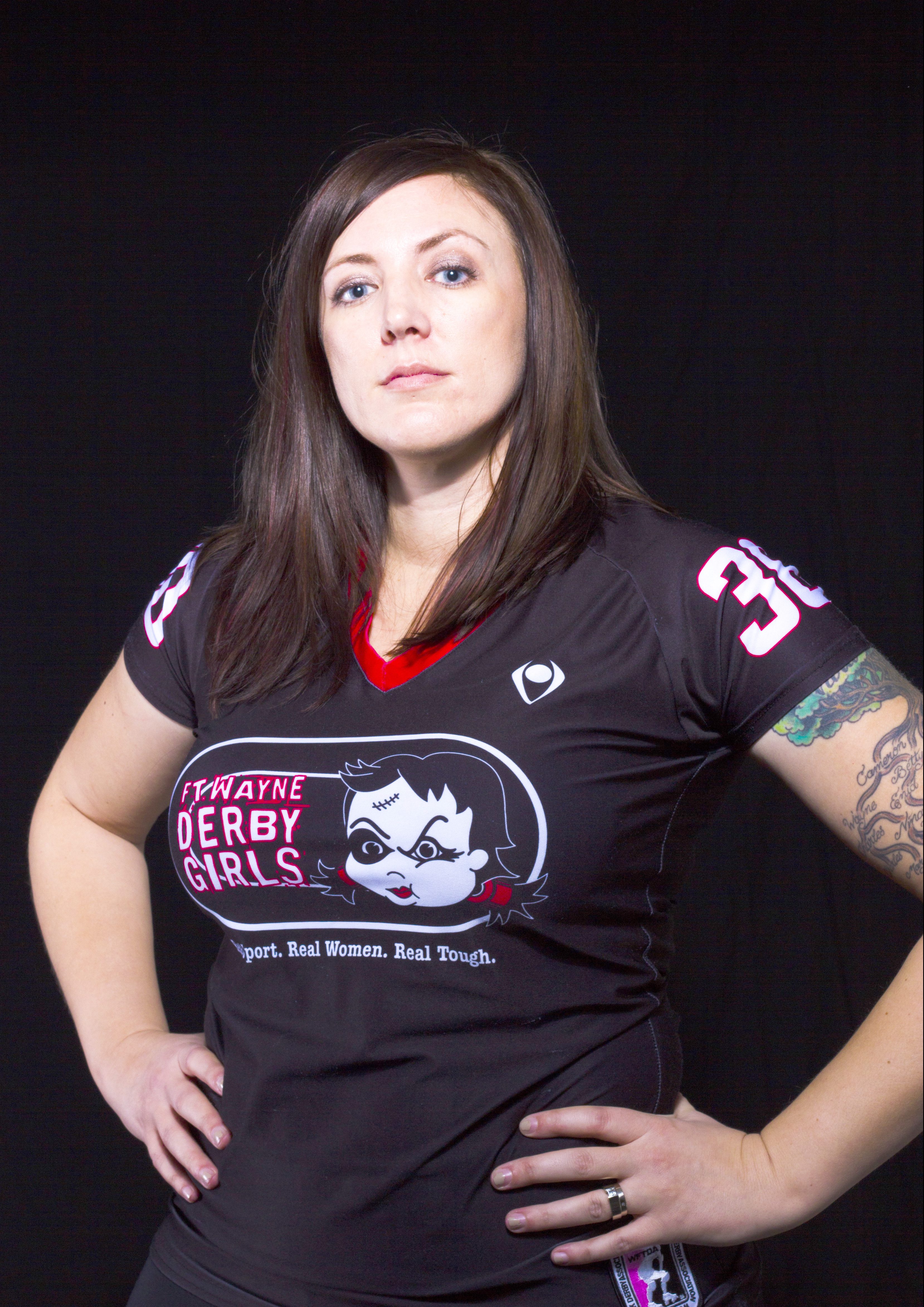Two Fort Wayne women saw a derby bout on vacation one day in 2005, and they decided to bring it to Fort Wayne, Salyers says. They recruited a couple friends to join but needed more team members, so they papered the city with fliers in restaurants, record stores, and bars—which Salyers saw. She remembers thinking, “I don’t know what this is, but I’m doing this.” She’d always been into physical sports as a kid, and she knew how to skate, so derby seemed like a perfect fit. Salyers was one of the first members who hadn’t been specifically recruited by friends.