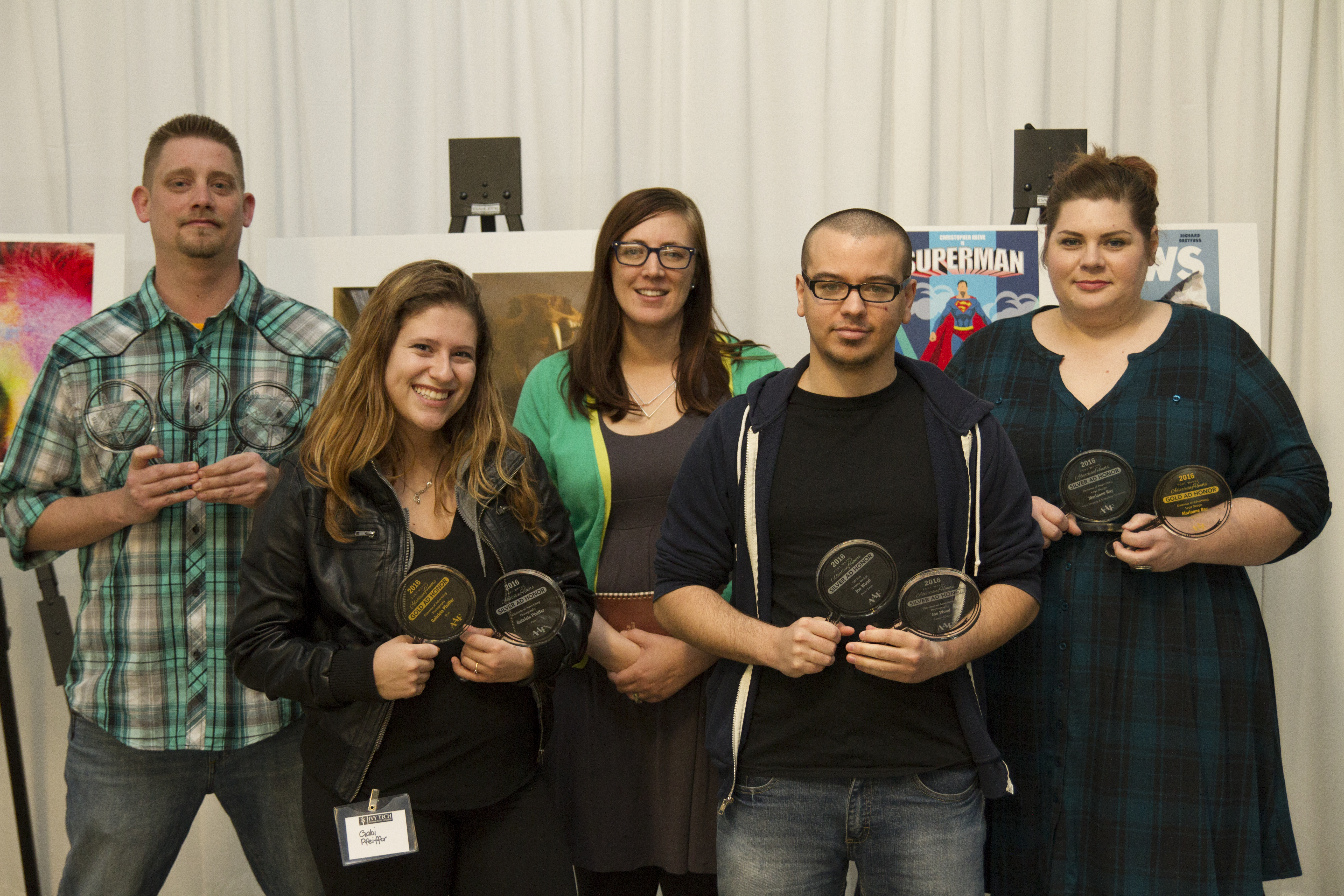 Those students are, from left (below): Jordan Krieger, Gabi Pfeiffer, Salyers, Joe Wood, and Marianne Bay. Not pictured are Stephanie Petras and James Fazzaro, a computing and informatics student who does videography and photography on the side. He saw a flier advertising the awards and asked Salyers if he’d be able to submit something, too.