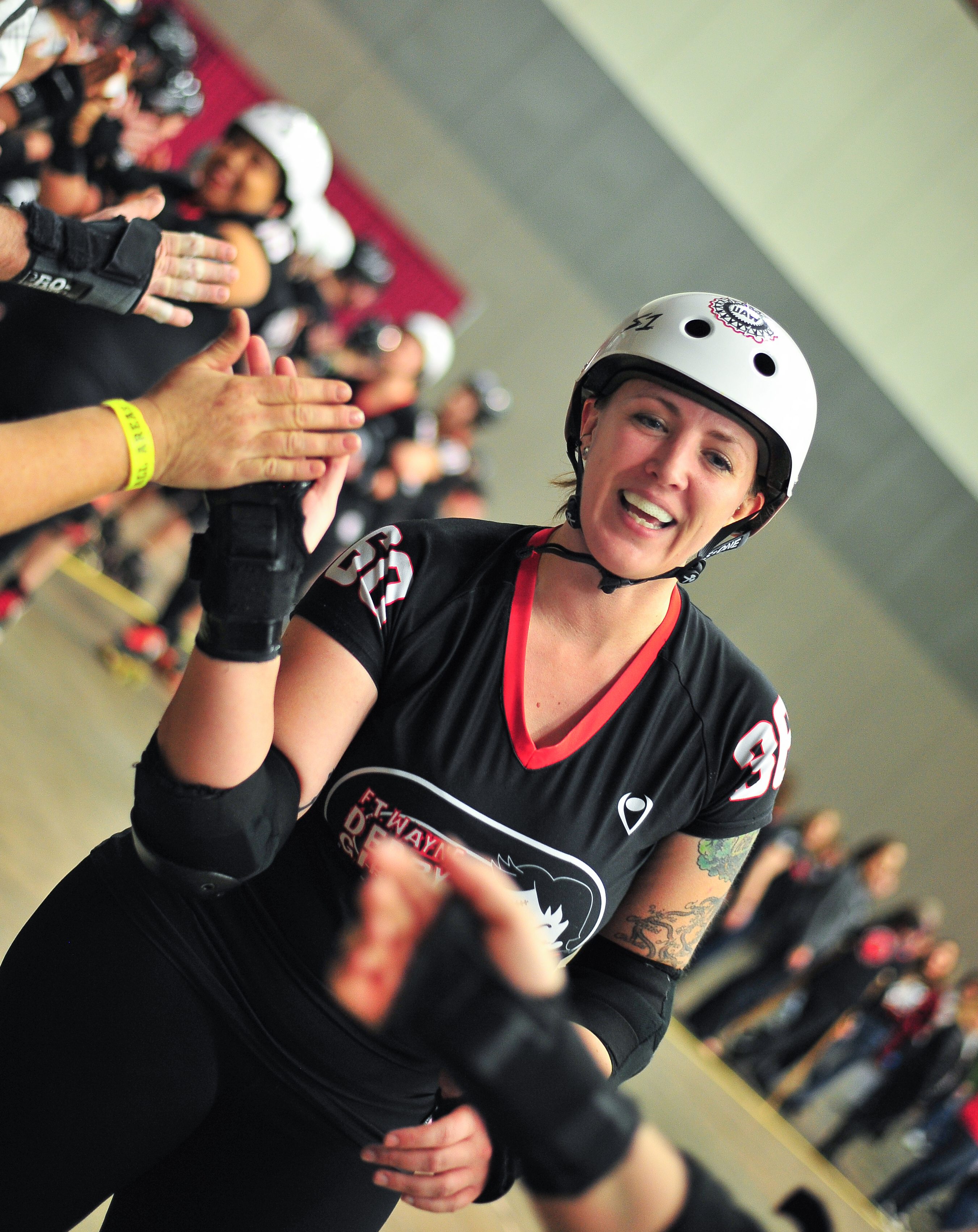 Her two big injuries did happen during her first few years with derby, before her daughters were born and before the rule changes: The first year she played, she broke her tailbone at practice.
