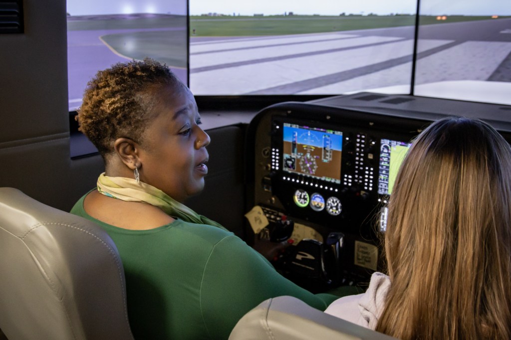“Anytime we’re struggling in the air, it’s always great practice to come back down here and review what we’ve missed in the simulator,” says Paul Hopkins, student in the Aviation Technology program. “It’s the biggest help, and it saves us a lot of money.”