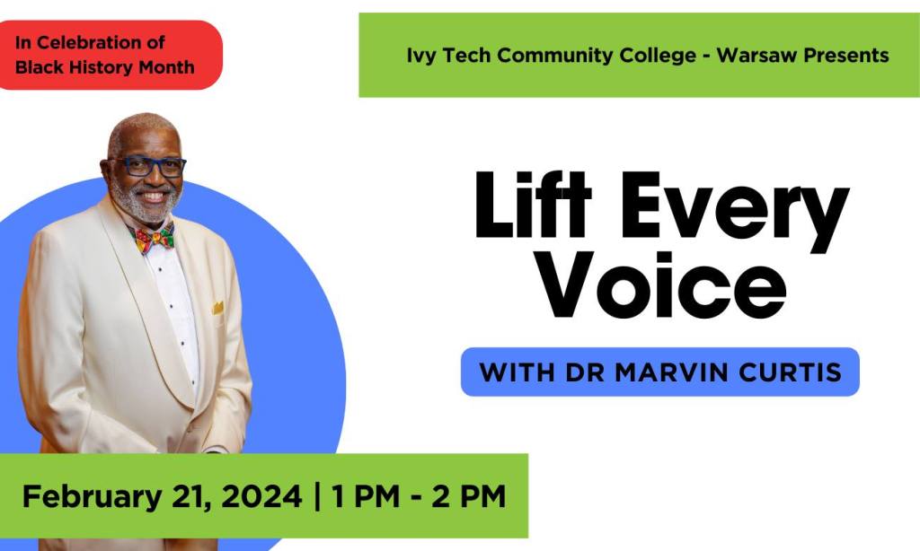 The community is invited to join Ivy Tech Community College Warsaw in celebrating Black History Month with a special presentation by Dr. Marvin Curtis titled Lift Every Voice. It’s happening Feb. 21 at Miller Hall (2545 Silveus Crossing) from 1 to 2 p.m.