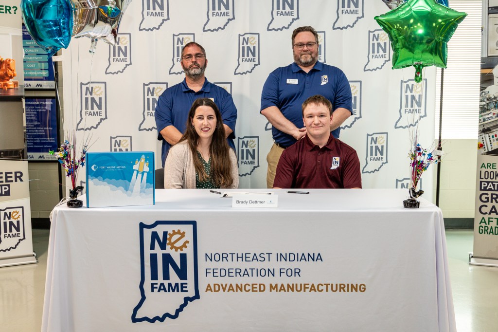Ten high school students signed on to join the fifth cohort of the Northeast Indiana Federation for Advanced Manufacturing Education (NEINFAME)—a partnership that includes Ivy Tech Community College Fort Wayne and Kosciusko County—on April 24. The students, along with company representatives and mentors, signed certificates of commitment in Ivy Tech Fort Wayne’s Flex Lab within The Steel Dynamics, Inc. Keith E. Busse Technology Center.