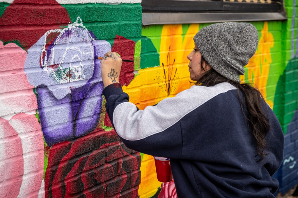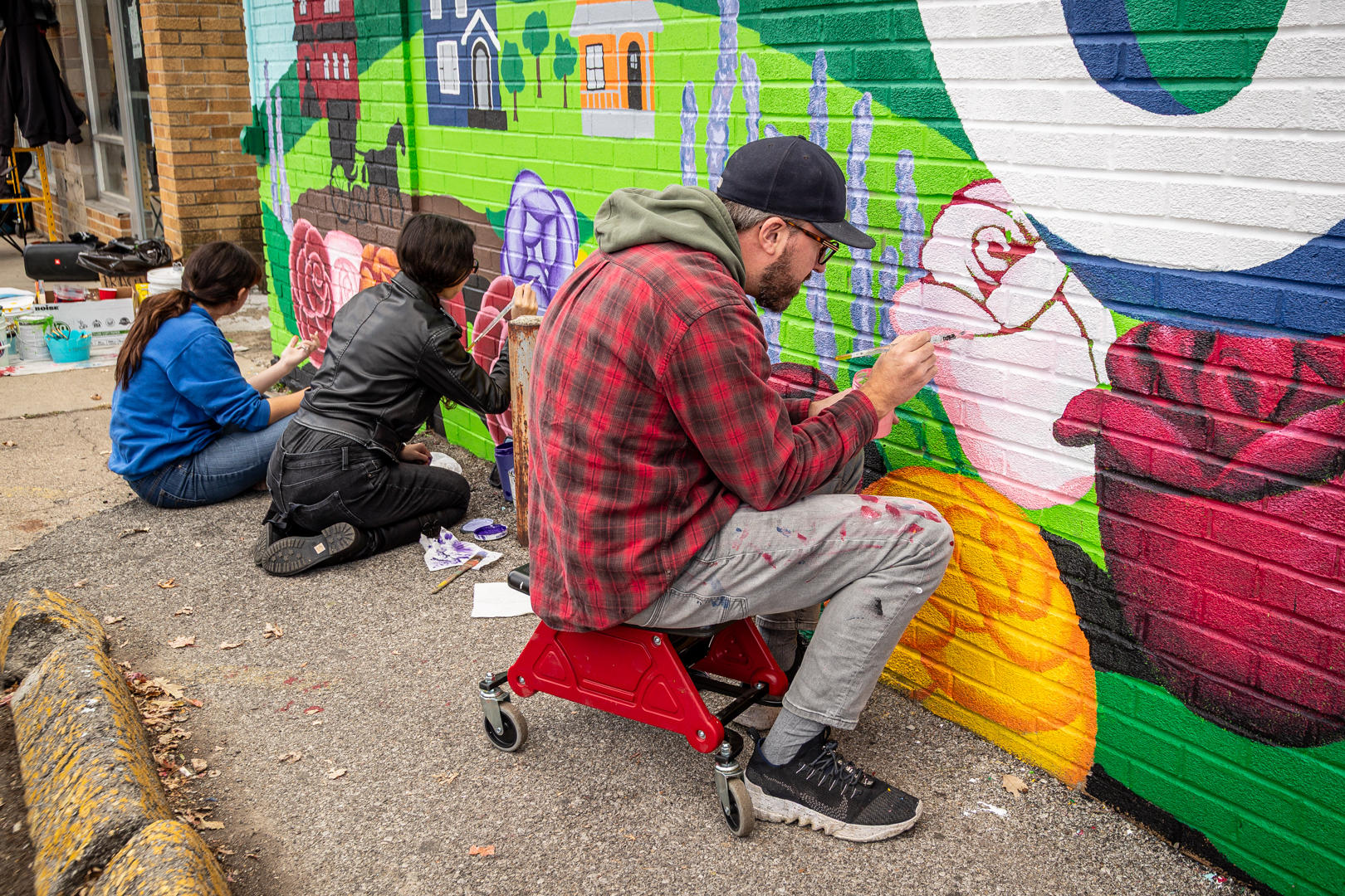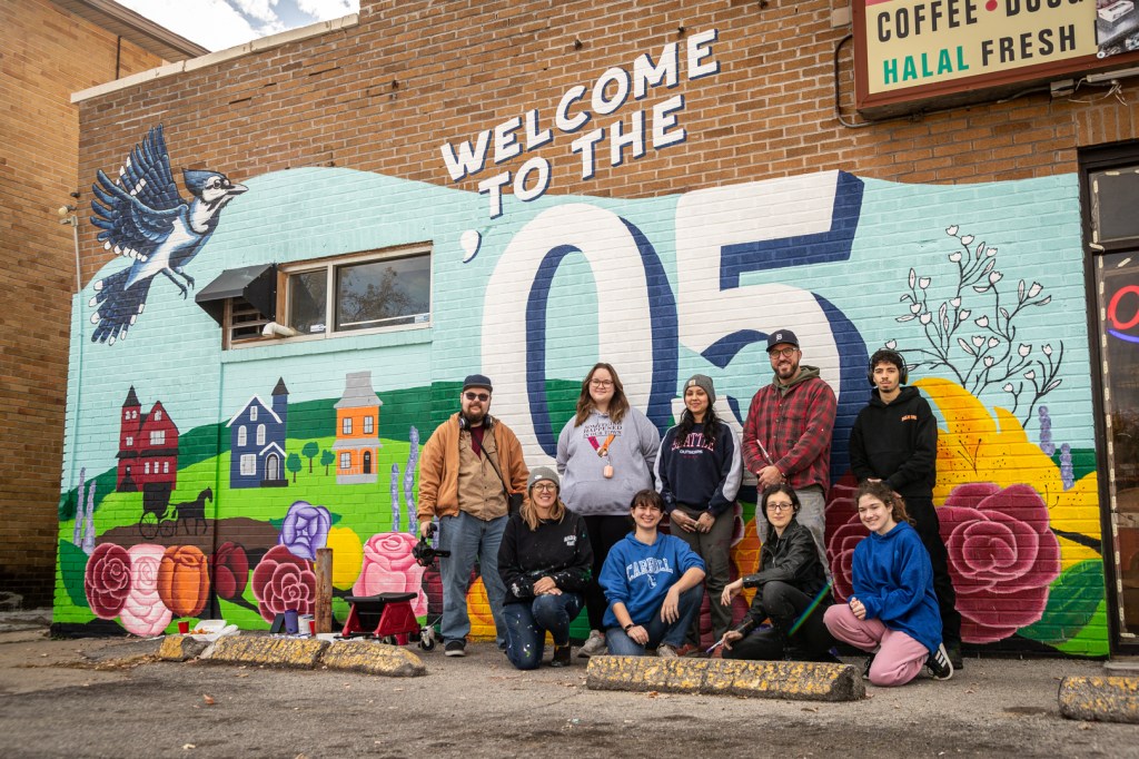 The mural’s design reflects the heart of the Lakeside Park area, known for its welcoming residents, lively streets, and the iconic Lakeside Park rose garden. It features a row of houses representing the historic homes in the area, an abundance of colorful flowers beneath a bright blue sky, and a bold message near the entrance to the market: “Welcome to the ’05.”